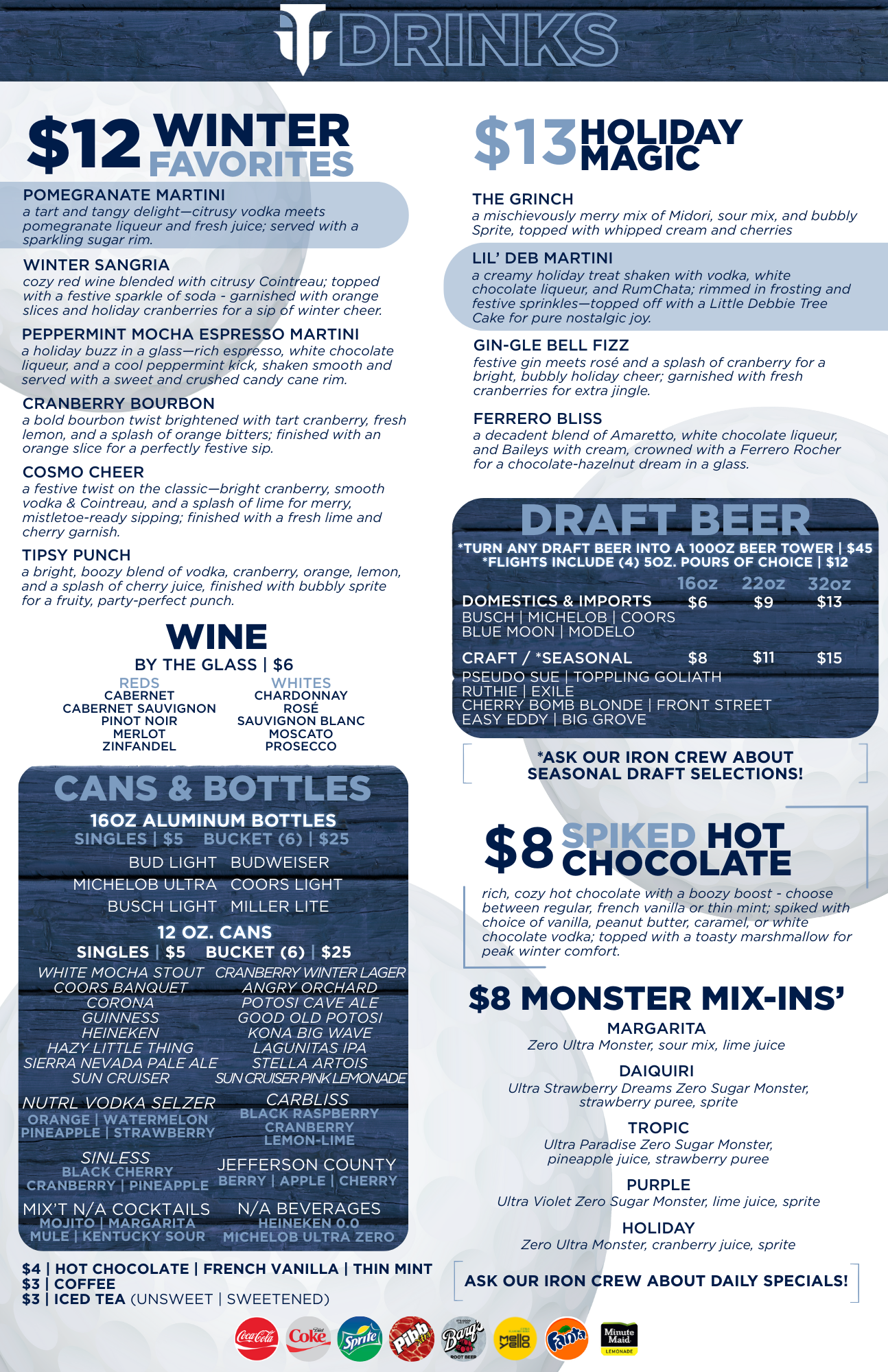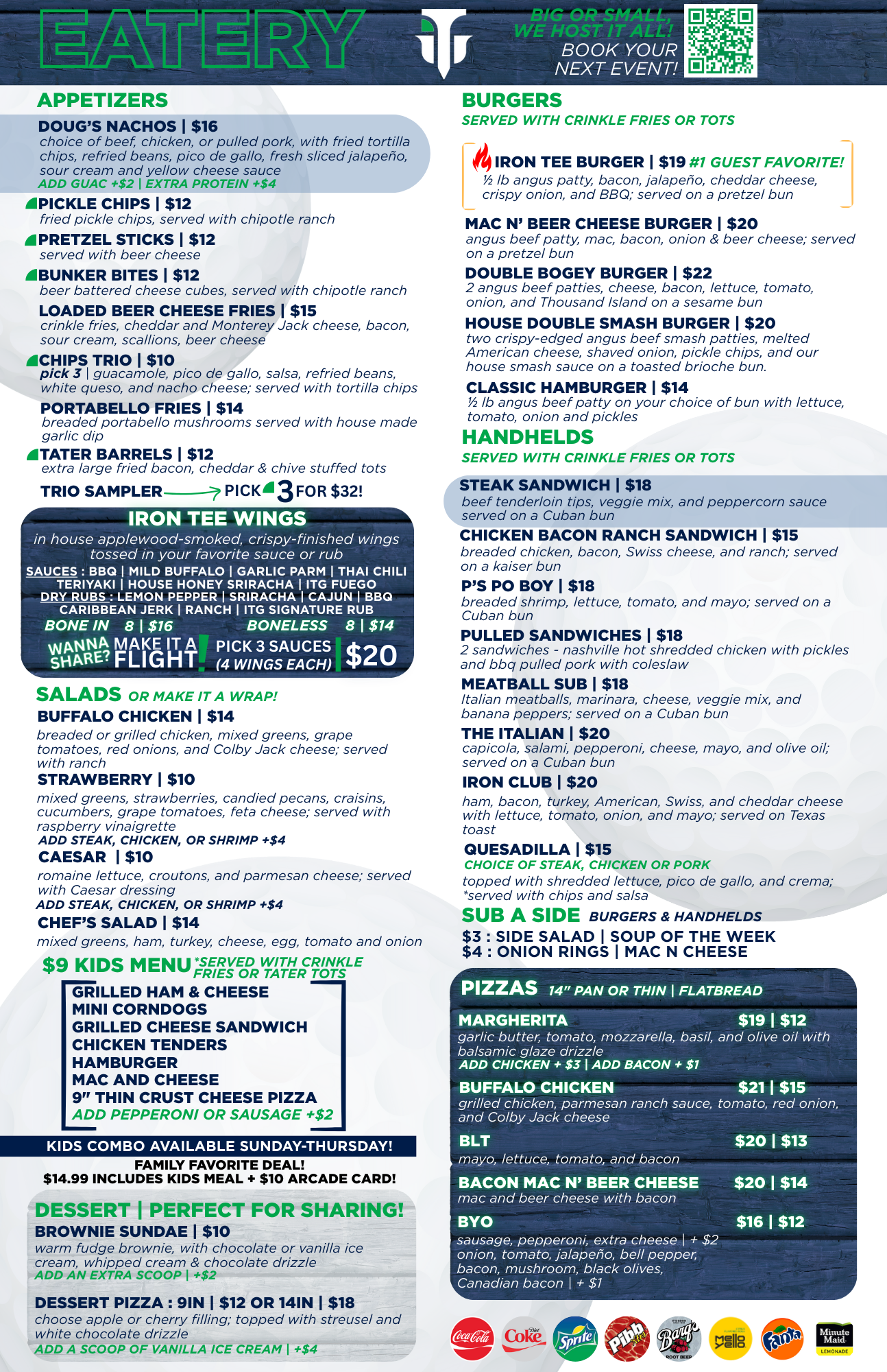 After a round of golf or a high-energy arcade session, refuel with mouthwatering meals and refreshing drinks at Iron Tee Golf. Located on Level 2, our restaurant features a diverse lunch and dinner menu with something for everyone, from classic favorites to bold new flavors. And with 360 degrees of massive 100" TVs, it's hands-down the best place in the Quad Cities to catch the game while you eat. Grab a seat, relax and let our friendly staff take care of the rest. Check out our full menu to explore all our tasty offerings!
